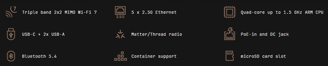 Маршрутизатор Wi-Fi 7 (2,4 ГГц+5 ГГц+6 ГГц), 5x2.5G Ethernet, Bluetooth 5.4, USB-C, 2хUSB-A 3.0, microSD