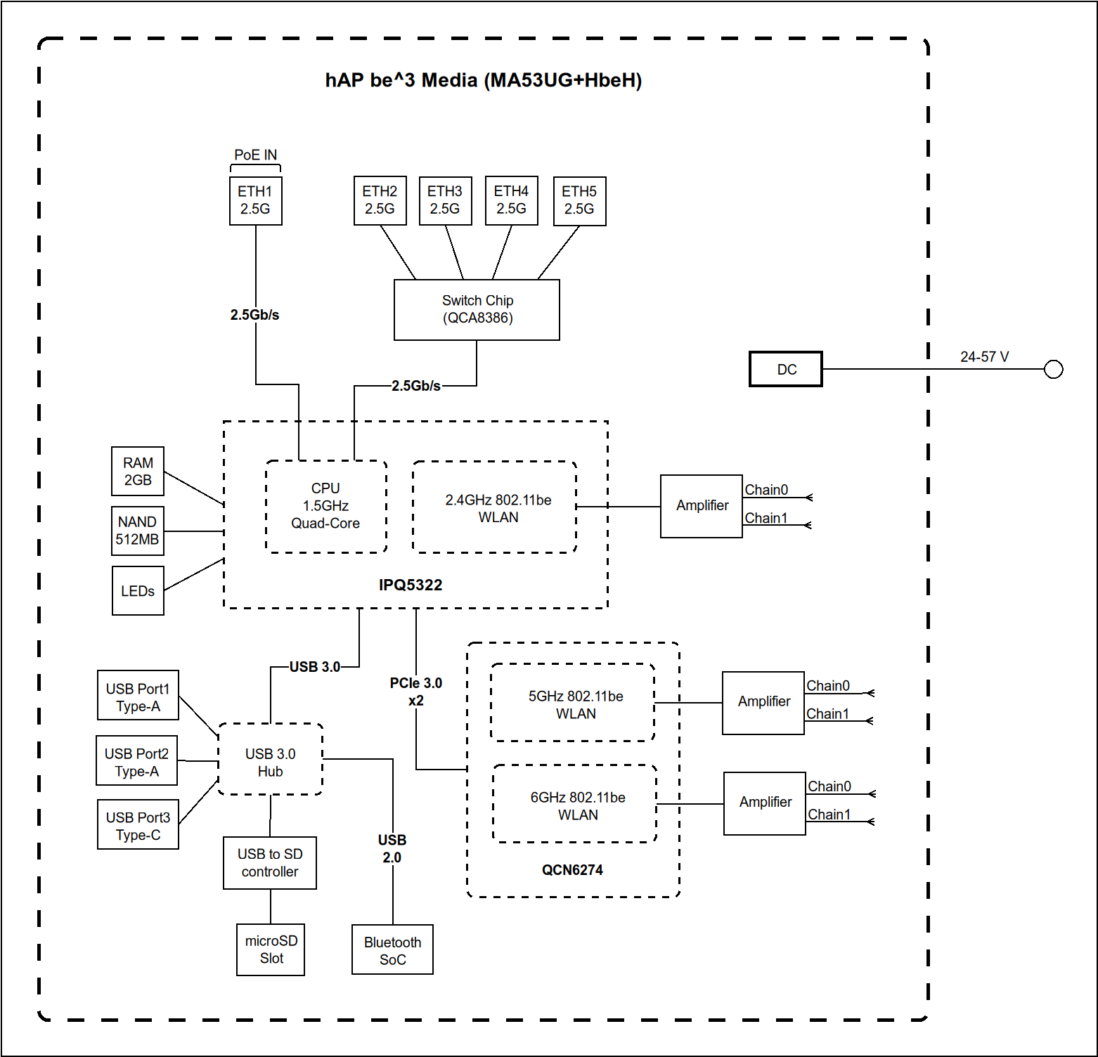 | Wireless 2.4 GHz | 574 Mbit/s, 2 chains, 802.11b/g/n/ax/be, 4 dBi, IPQ-5322, Wi-Fi 7 |